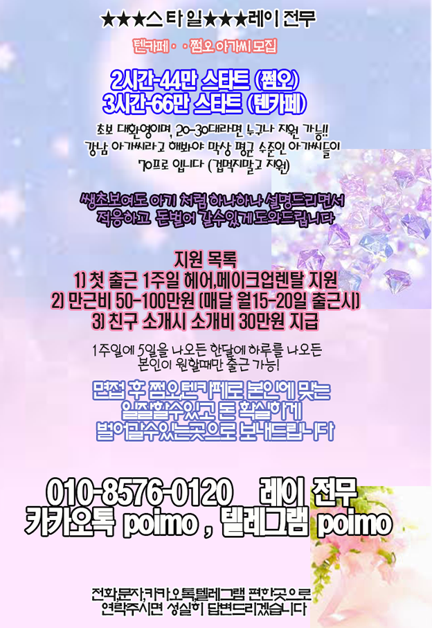 👠 텐카페 쩜오 아가씨 구해요 (쌩초보 대환영), 페이 당일 지급엄수 텐프로/쩜오 · 서울 · 강남 · 스타일 · 2025-10-20 지역 서울 · 강남 상호 스타일 급여 일급 1500000 담당자 레이 poimo poimo 적립번호 0503-6100-6611 전화 연결하기 적립번호로 연결하여 2분이상의 통화가 이루어질 경우 6,600원이 지급됩니다. 첨부파일 revised_68f632a8899d56.59498782.png